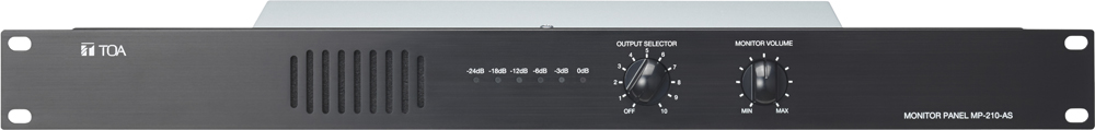 The MP-16 is a 16-channel audio monitor panel, which can be mounted on an EIA standard equipment rack (2 unit size). It allows monitoring 25/70/100 V high impedance speaker line, low impedance speaker line and line level audio signals by LED level meters. One of the 16 channels audio can be monitored with a built-in speaker or an optional headphone.